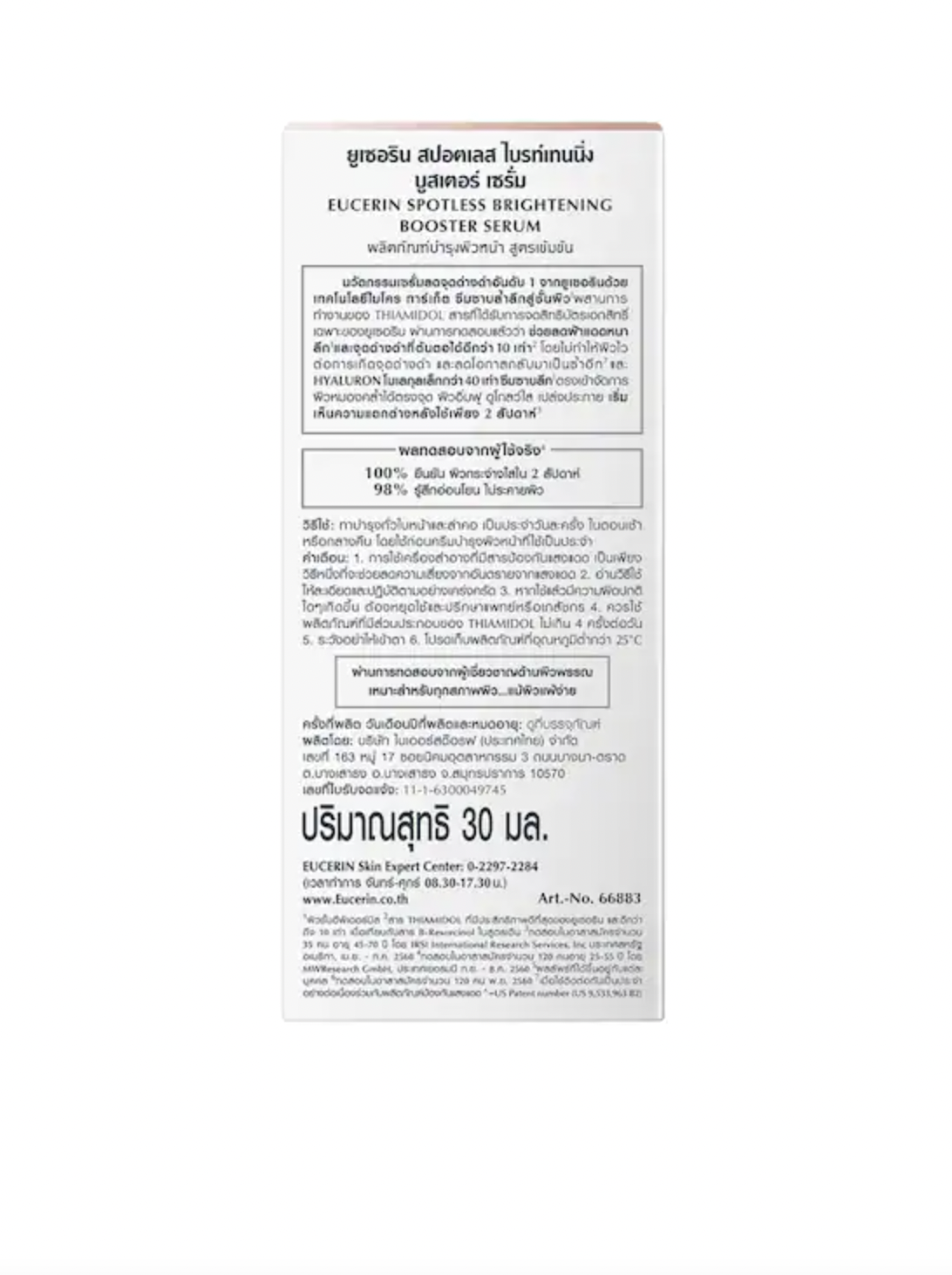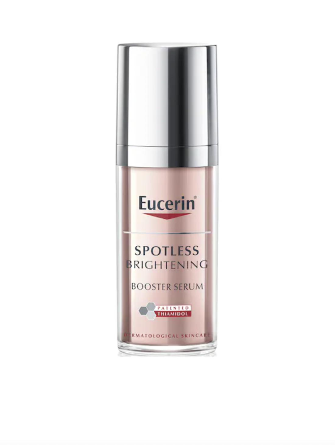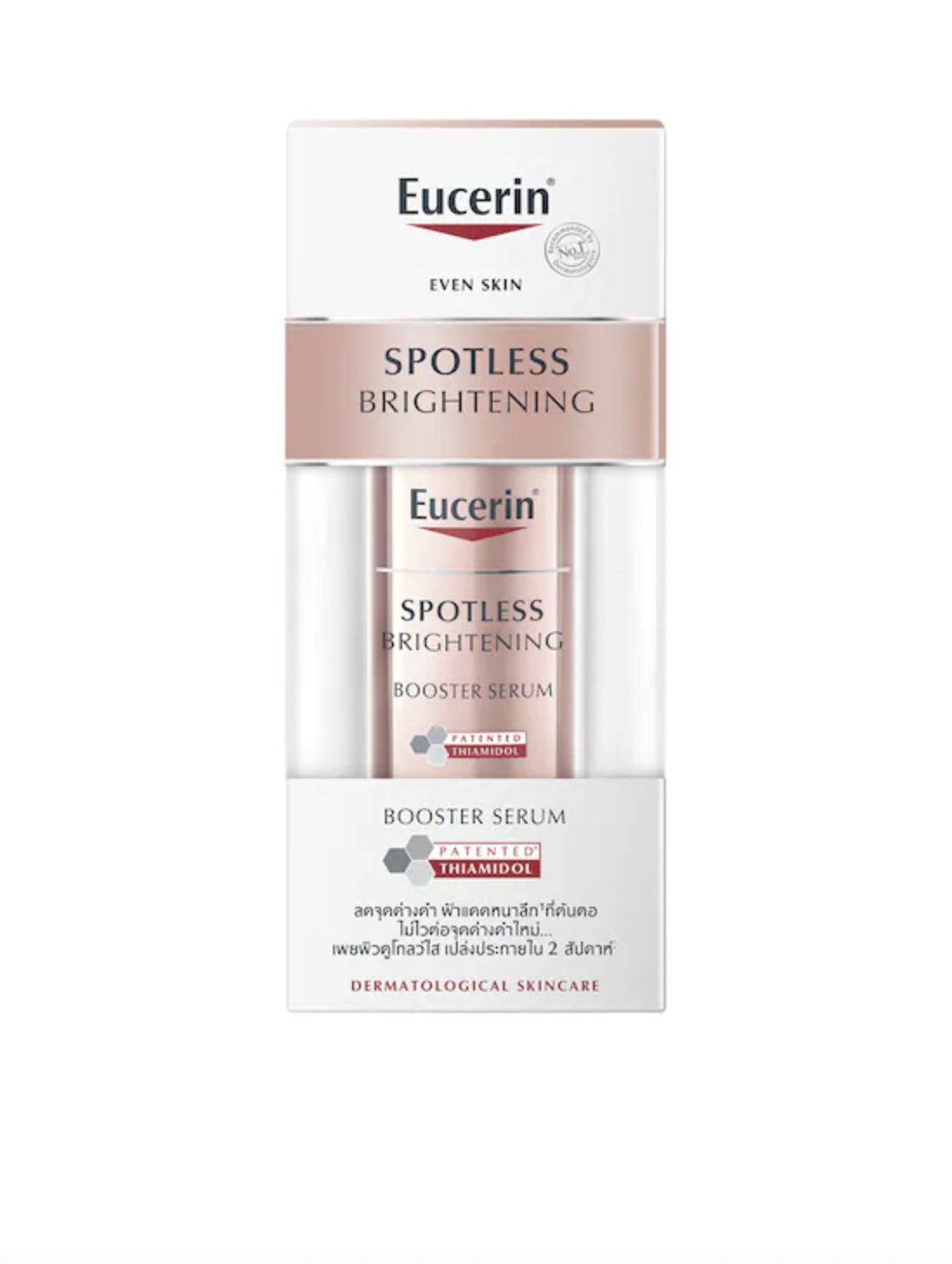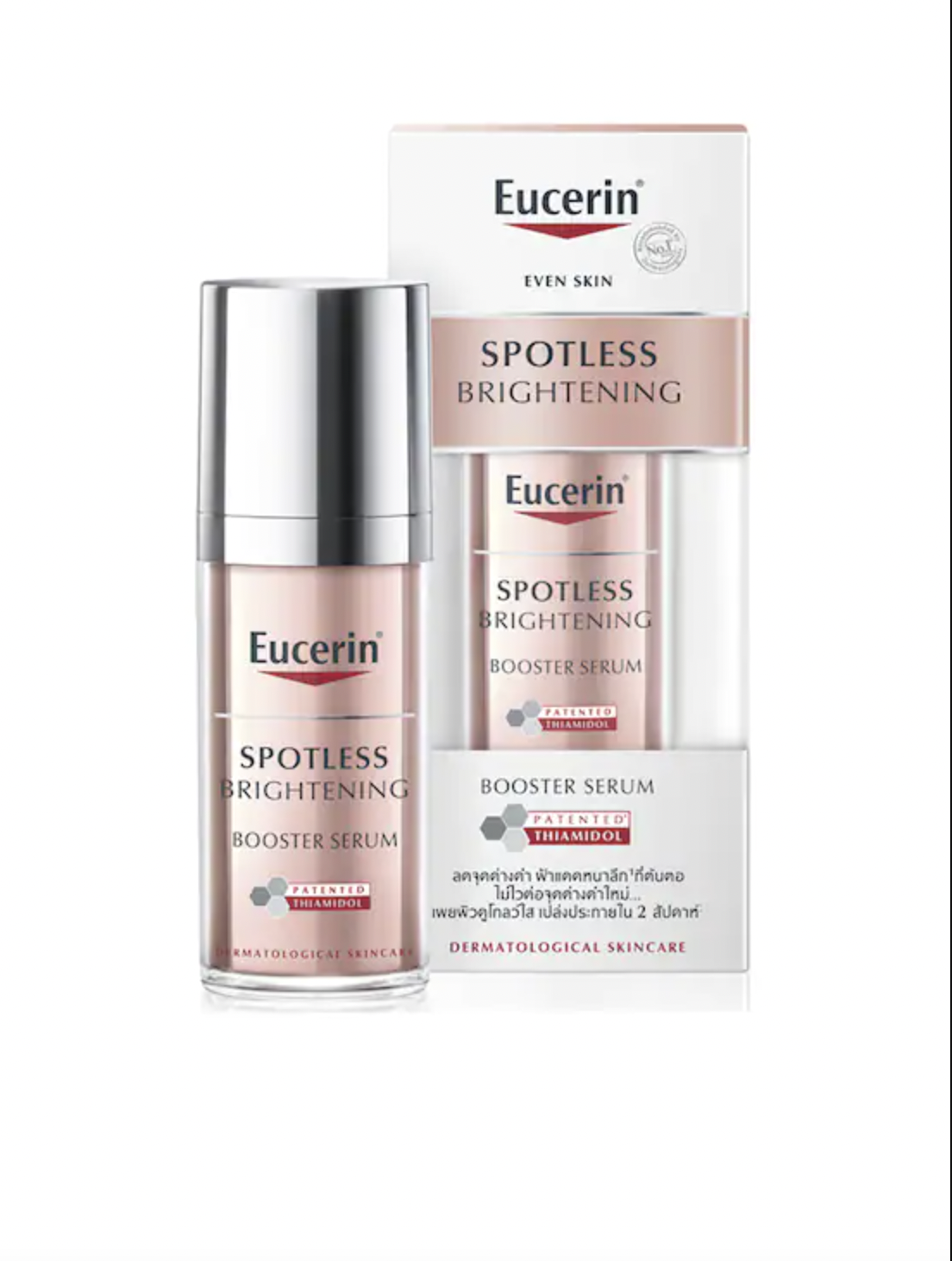 EUCERIN ยูเซอริน สปอตเลส ไบรท์เทนนิ่ง บูสเตอร์ เซรั่ม นวัตกรรมเซรั่มลดจุดด่างดำอันดับ 1 จากยูเซอรินด้วยเทคโนโลยีไมโคร ทาร์เก็ต ซึมซาบล้ำลึกสู่ชั้นผิวผสานการทำงานของ THIAMIDOL สารที่ได้รับการจดสิทธิบัตรเอกสิทธิ์เฉพาะของยูเซอริน ผ่านการทดสอบแล้วว่า ช่วยลดฝ้าแดดหนาลึกและจุดด่างดำที่ต้นตอได้ดีกว่า 10 เท่า โดยไม่ทำให้ผิวไว ต่อการเกิดจุดด่างดำ และลดโอกาสกลับมาเป็นซ้ำอีก และ HYALURON โมเลกุลเล็กกว่า 40 เท่า ซึมซาบลึก1ตรงเข้าจัดการ ผิวหมองคล้ำได้ตรงจุด ผิวอิ่มฟู ดูโกลว์ใส เปล่งประกาย